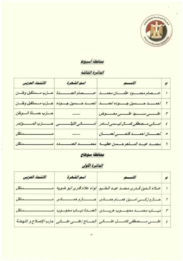 والإعادة بين 4 مرشحين بالدائرة الثانية أخميم بسوهاج شعبان لطفي – زكريا محمد – عصام رأفت – عفيفي الشريف.