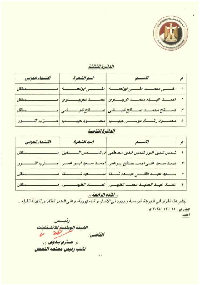 الإعادة بين 4 مرشحين بالدائرة الثامنة إيتاي البارود بالبحيرة وهم: إعادة بين شمس الدين أنور – أحمد سعيد – سعيد عبدالغني – عماد عبدالحميد