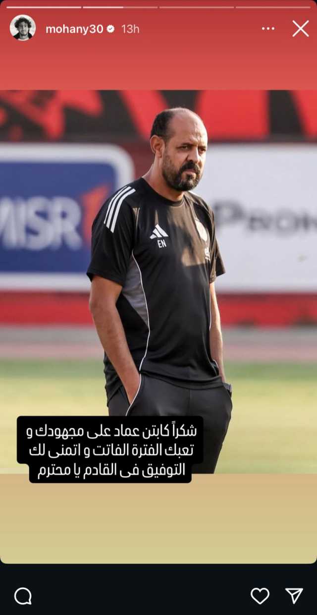 وكتب محمد هاني عبر حسابه على انستجرام: “شكرا كابتن عماد على مجهودك وتعبك الفترة اللي فاتت واتمنى لك التوفيق في القادم يا محترم”.