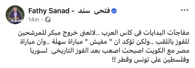 وكتب سند على حسابه الشخصي بموقع فيسبوك: "مفاجآت البدايات فى كاس العرب .. لاتعنى خروج مبكر للمرشحين للفوز باللقب ..ولكن تؤكد ان " مفيش “ مباراة سهلة ..وان مباراة مصر مع الكويت اصبحت اصعب بعد الفوز التاريخى لسوريا وفلسطين على تونس وقطر”.