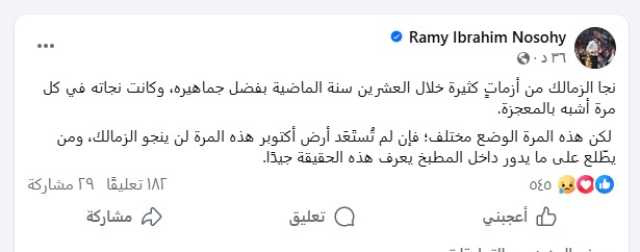 وقال رامي نصوحي عضو مجلس إدارة نادي الزمالك عبر حسابه الشخصي على موقع التواصل الإجتماعي فيسبوك :"نجا الزمالك من أزماتٍ كثيرة خلال العشرين سنة الماضية بفضل جماهيره، وكانت نجاته في كل مرة أشبه بالمعجزة..لكن هذه المرة الوضع مختلف؛ فإن لم تُستَعَد أرض أكتوبر هذه المرة لن ينجو الزمالك، ومن يطّلع على ما يدور داخل المطبخ يعرف هذه الحقيقة جيدًا".