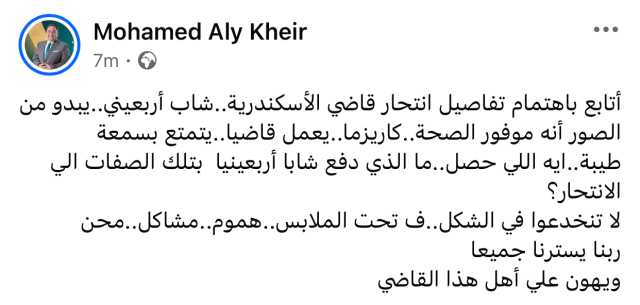 وكتب خير على حسابه الشخصي بموقع فيسبوك: “أتابع باهتمام تفاصيل انتحار قاضي الأسكندرية، شاب أربعيني يبدو من الصور أنه موفور الصحة كاريزما يعمل قاضيا، يتمتع بسمعة طيبة”.