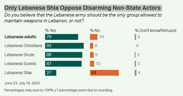 أظهر استطلاع حديث لمؤسسة "غالوب" أن 79% من اللبنانيين يؤيدون حصر حمل السلاح بالجيش وحده. وشمل الاستطلاع، الذي أُجري بين حزيران وتموز، معظم المناطق اللبنانية باستثناء نحو 10% من السكان في مناطق في الجنوب والبقاع والضاحية الجنوبية.وعلى مستوى الانقسامات الطائفية، يؤيد حصرية السلاح بيد الجيش 92% من المسيحيين و89% من الدروز و87% من السنة، مقابل 27% فقط من الشيعة، فيما يعارض 69% من أبناء الطائفة الشيعية حصر السلاح بالمؤسسة العسكرية. في المقابل، حافظ الجيش على مستوى ثقة لافت، إذ أعرب 94% من اللبنانيين عن ثقتهم به، بينهم 98% من الشيعة، ما يكرّسه كإحدى آخر المؤسسات الوطنية الجامعة.