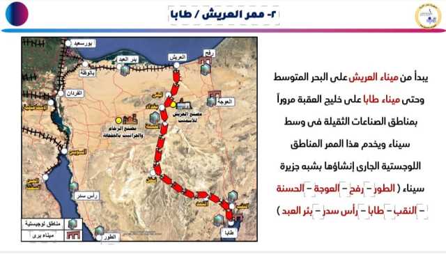 وتتمثل هذه الممرات اللوجستية المتكاملة في ممر السـخنة – الإسكندرية اللوجيستي والذي يمتد من ميناء السخنة علي البحر الأحمر مروراً بميناء العاشر من رمضان الجاف والمنطقة اللوجستية وربطه بشبكة السكك الحديدية من خلال خط الروبيكي - العاشر من رمضان – بلبيس بطول 63,5 كم والمنطقة الصناعية بالعاشر من رمضان مرورا بالقاهرة المركز الحضري الأضخم في الشرق الأوسط ثم بمدينة السادس من أكتوبر الصناعية والميناء الجاف والمنطقة اللوجستية وصولا لميناء الإسكندرية الكبير، وممر العريش – طابا اللوجيستي الذي يبدأ من ميناء العريش علي البحر المتوسط وحتي ميناء طابا علي خليج العقبة مروراً بمناطق الصناعات الثقيلة في وسط سيناء ويخدم هذا الممر المناطق اللوجستية الجاري إنشاؤها بشبه جزيرة سيناء ( الطور – رفح – العوجة – الحسنة – النقب – طابا – رأس سدر – بئر العبد)