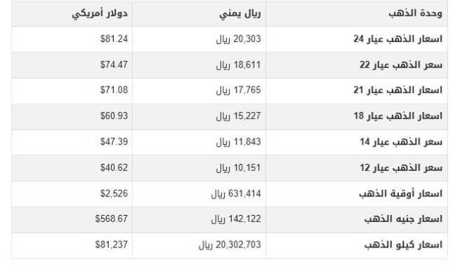 في التقرير التالي نعرض كم متوسط سعر الذهب اليوم في اليمن الثلاثاء 27-8-2024 عيار (24، 22، 21، 18، 14، 12) بأسواق المال في اليمن “YEM” بالعملة المحلية الريال اليمني مقابل الدولار الأمريكي.