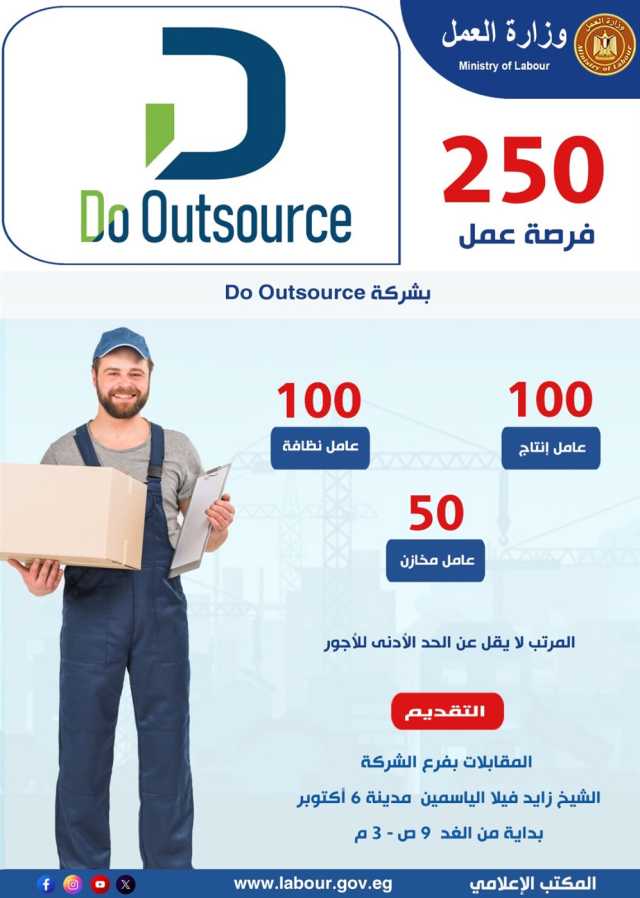 أعلنت وزارة العمل بالتعاون مع مديرية قوى عاملة الجيزة والإدارة العامة للتشغيل، عن توفير 250 فرصة عمل جديدة بشركة "دو أوتسورس".