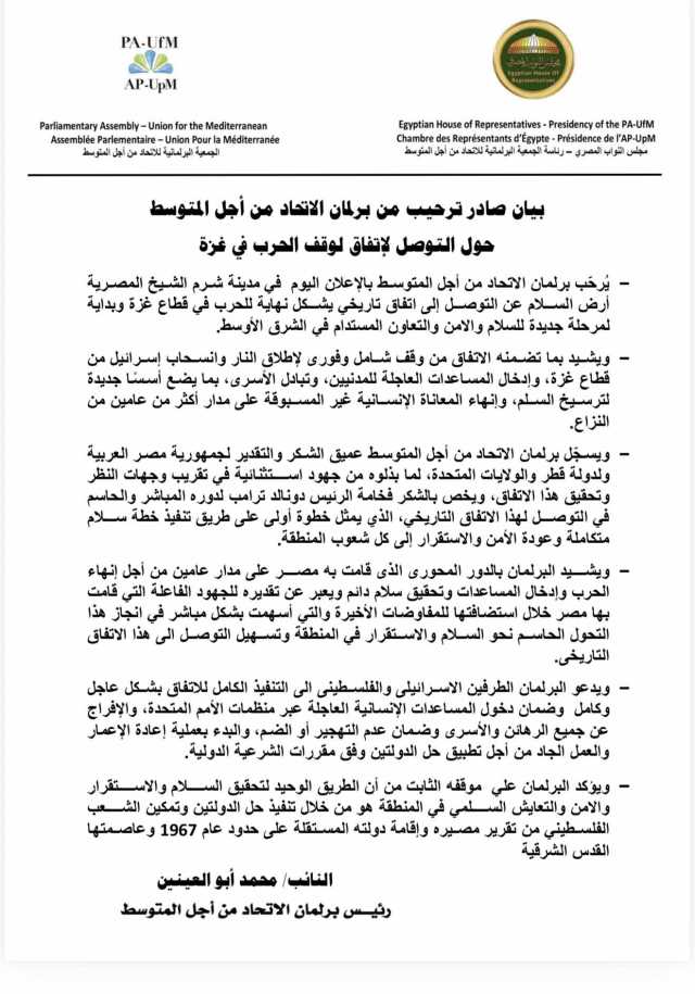 برئاسة محمد أبو العينين.. برلمان الاتحاد من أجل المتوسط يرحب بإتفاق وقف إطلاق النار