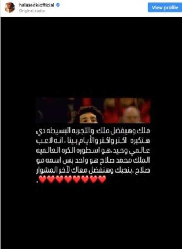 وشاركت هالة صدقي، صورة عبر حسابها الرسمي بموقع تداول الصور والفيديوهات «إنستجرام»، وعلقت عليها قائلة: «ملك وهيفضل ملك، والتجربة البسيطة دي هتكبره أكتر وأكتر، والأيام بينا، مؤكدة ثقتها في استمرار نجاحه، محمد صلاح لاعب عالمي وحيد، هو أسطورة الكرة العالمية، واحد بس اسمه مو صلاح، معربة عن حبها ودعمها الكامل، قائلة: بنحبك وهنفضل معاك لآخر المشوار».