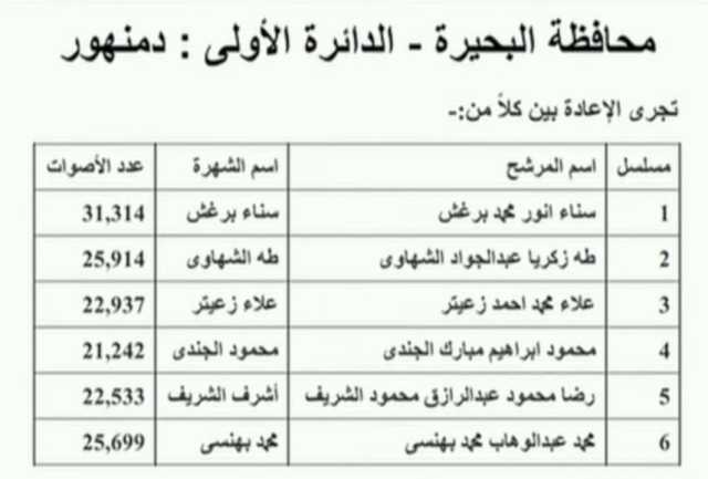 أعلن رئيس الهيئة الإعادة بين 6 مرشحين بالدائرة الأولى دمنهور بالبحيرة وهم : إعادة بين سناء أنور – طه زكريا – علاء محمد – محمود إبراهيم – رضا محمود – محمد عبدالوهاب.