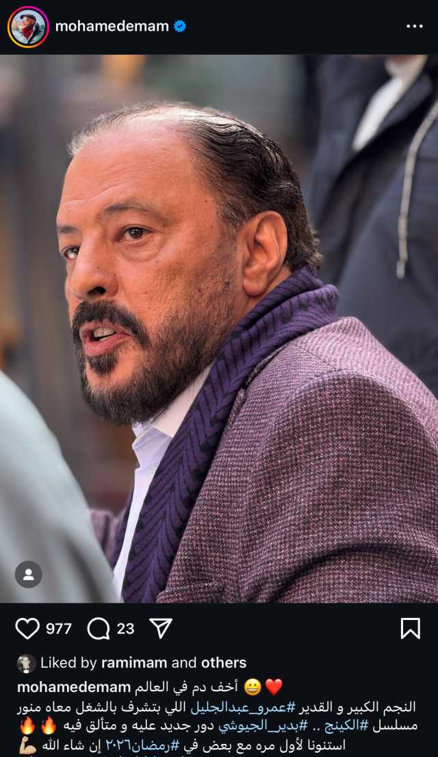 وعلق محمد إمام على الصورة قائلاً: "أخف دم في الدنيا، النجم الكبير والقدير عمرو عبدالجليل اللي بتشرف بالشغل معاه منور مسلسل كينج، بدير الجيوشي، دور جديد عليه ومتألق فيه، استنونا لأول مرة مع بعض في رمضان ٢٠٢٦ إن شاءالله".