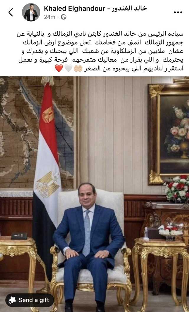 وكتب الغندور على حسابه الشخصي بموقع فيسبوك: “سيادة الرئيس من خالد الغندور كابتن نادي الزمالك و بالنيابة عن جمهور الزمالك اتمني من فخامتك تحل موضوع ارض الزمالك عشان ملايين من الزملكاوية من شعبك اللي بيحبك ويقدرك و يحترمك واللي بقرار من معاليك هتفرحهم فرحة كبيرة وتعمل استقرار لناديهم اللي بيحبوه من الصغر”.