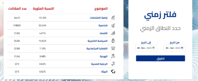 وضمن محاولات جذب الناخبين، يعتمد المرشحون على المنصات الصحفية المختلفة لنقل آرائهم وبرامجهم إلى جميع المواطنين الذين قد لا يتمكنون من حضور الجولة الانتخابية، لذا فإن الصحافة في العادة تغطي كافة الجوانب المتعلقة بالبرنامج الرئاسي، وهنا يأتي دور صفحة اختبار قياس "مشاعر الإعلام" من أجل الحصول على نظرة عامة حول التغطية الصحفية.
