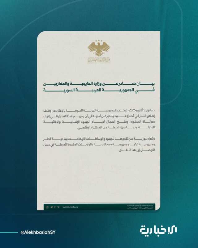 كما أعربت عن أملها في أن يسهم هذا التطور في إنهاء معاناة المدنيين وفتح المجال أمام الجهود الإنسانية والإغاثية العاجلة، بما يمهد لمرحلة جديدة من الاستقرار الإقليمي.