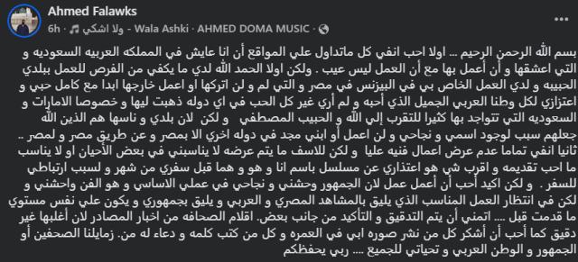 وكتب فلوكس عبر حسابه بموقع فيسبوك: “بسم الله الرحمن الرحيم ... أولا أحب أنفي كل ما تداول على المواقع أن أنا عايش في المملكة العربية السعودية والتي أعشقها وأن أعمل بها مع أن العمل ليس عيب”.