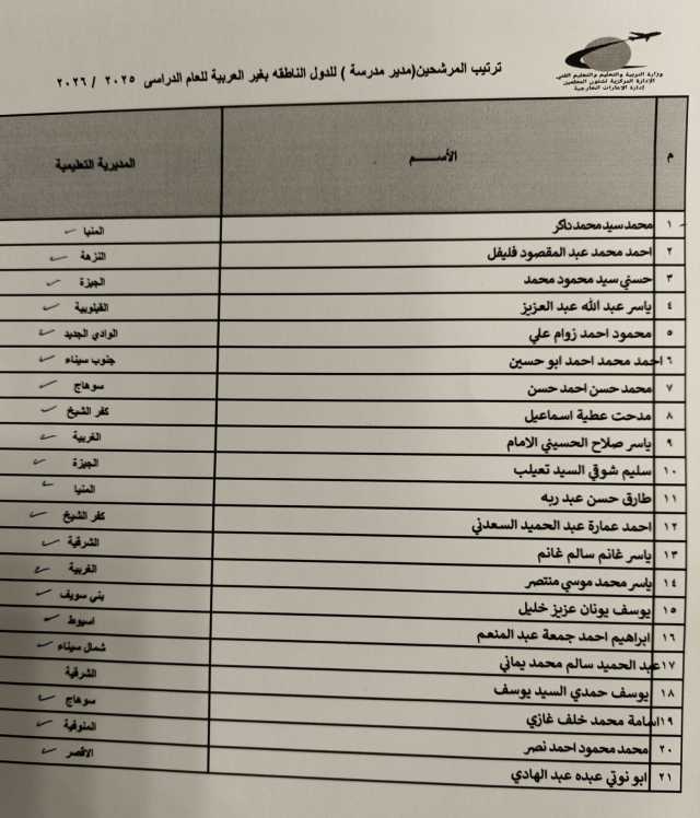 وقررت إدارة الإعارات الخارجية في وزارة التربية والتعليم والتعليم الفني أن يتم عقد المقابلات التصفوية لمديري المدارس المرشحين لـ الإعارات الخارجية للدول الناطقة بغير العربية ، يوم الأحد الموافق 14 ديسمبر 2025 بمقر الاعارات الخارجية بديوان عام الوزارة ، مشددة على أن ذلك للمرشحين الحاصلين على نسبة ٧٥٪ فأكثر في المقابلة الأولى، تمهيدًا لإختيار أفضل العناصر الأكثر كفاءة وتميزًا، ووفقًا لتعليمات وتوجيهات محمد عبد اللطيف وزير التربية والتعليم والتعليم الفني .