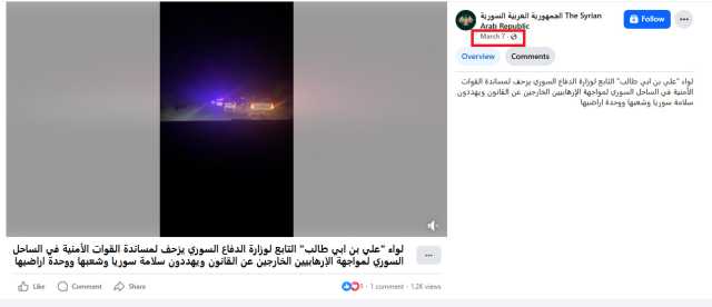 وقتها، كتبت الصفحة تعليقًا على الفيديو: "لواء علي بن أبي طالب التابع لوزارة الدفاع السوري يزحف لمساندة القوات الأمنية في الساحل السوري لمواجهة الإرهابيين الخارجين عن القانون ويهددون سلامة سوريا وشعبها ووحدة أراضيها".