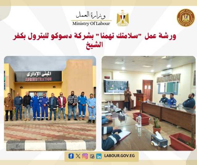 أُقيمت ورشة عمل توعوية بعنوان "سلامتك تهمنا" بمقر شركة دسوكو للبترول، وذلك تنفيذاً لتوجيهات وزير العمل محمد جبران بنشر ثقافة السلامة والصحة المهنية، وتحت إشراف الدكتور حسن هيكل مدير مديرية العمل بكفر الشيخ.