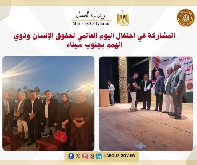 شاركت مديرية العمل بجنوب سيناء، ممثلة في أكرم محمد سيد أحمد مدير المديرية، في الاحتفالية التي نظمتها وحدة حقوق الإنسان بالمحافظة بمناسبة اليوم العالمي لحقوق الإنسان وذوي الهمم (قادرون باختلاف).