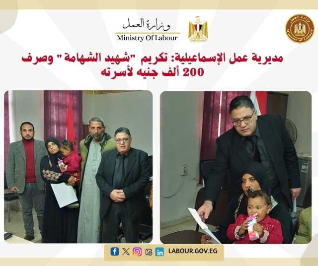 وقامت مديرية العمل بالإسماعيلية بتسليم أمر دفع بقيمة 200 ألف جنيه لصالح أسرة "شهيد الشهامة" بالقنطرة شرق (العامل من العمالة غير المنتظمة الذي ضحى بحياته لإنقاذ 13 فتاة).