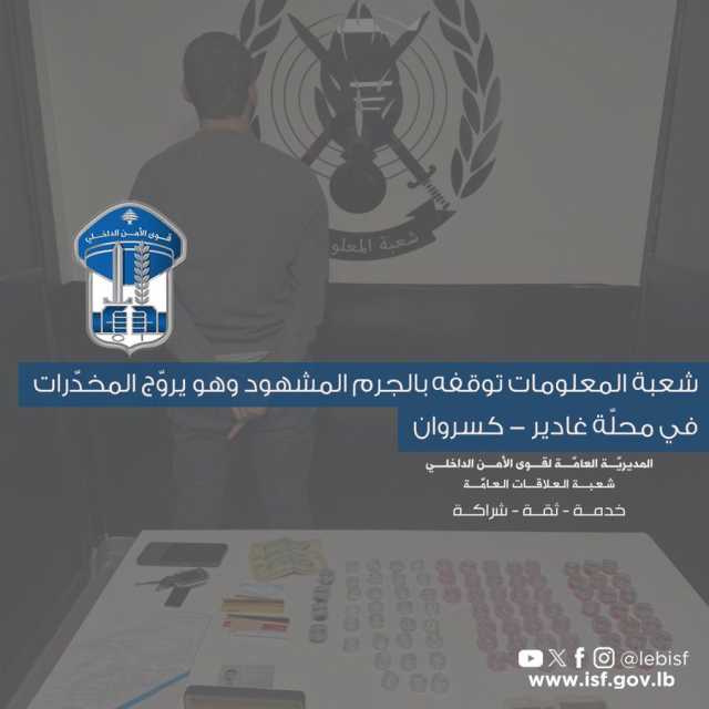 في إطار المتابعة المستمرّة التي تقوم بها قوى الأمن الدّاخلي للحدّ من تجارة المخدّرات وترويجها في مختلف المناطق اللبنانية، توافرت معطيات لشعبة المعلومات حول قيام شخص مجهول بترويج المخدّرات في مناطق كسروان، على متن درّاجة آليّة مجهولة المواصفات.