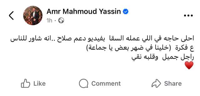 وكتب عمرو محمود ياسين عبر حسابه الشخصي بموقع فيسبوك: “أحلى حاجة في اللي عمله الشقا بفيديو دعم صلاح، انه شاور للناس على فكرة خلينا في ضهر بعض يا جماعة، راجل جميل وقلبه نقي”.