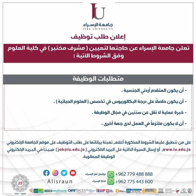صراحة نيوز- أعلنت جامعة الإسراء عن حاجتها لتعيين مشرف مختبر في كلية العلوم، وحددت الجامعة المتطلبات التالية للمتقدمين: