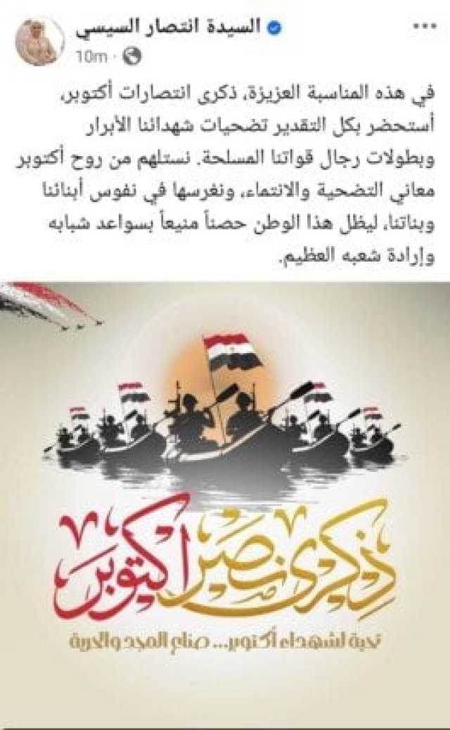 وكتبت عبر حسابها الرسمي على موقع التواصل الاجتماعي «فيس بوك»: «في هذه المناسبة العزيزة، ذكرى انتصارات أكتوبر، أستحضر بكل التقدير تضحيات شهدائنا الأبرار وبطولات رجال قواتنا المسلحة».