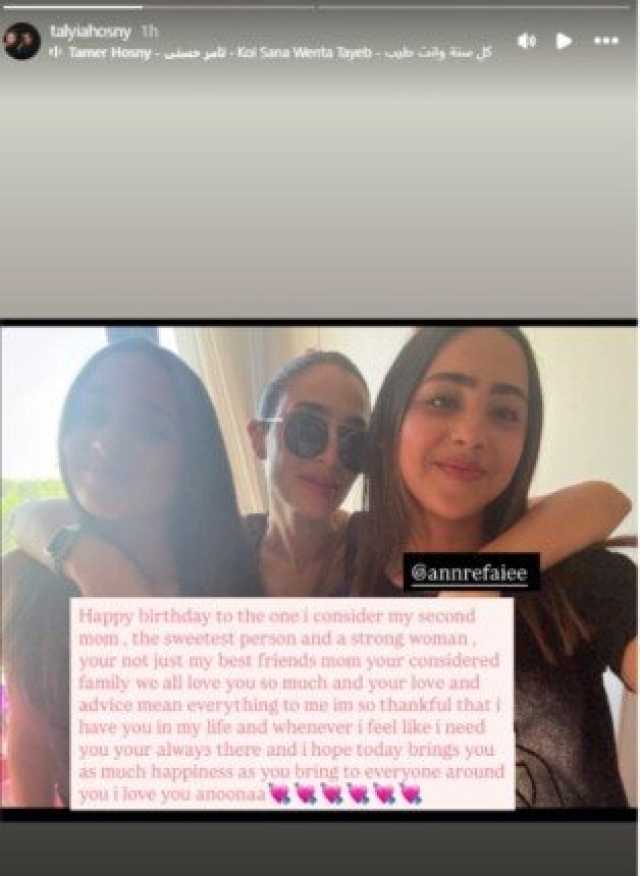 وأضافت تاليا تامر حسني: «أنتِ لستِ فقط أم صديقتي المقربة، بل أنتِ فرد من عائلتي، كلنا نحبكِ كثيراً، وحبكِ ونصائحكِ تعني لي الكثير، أنا ممتنة جداً لوجودكِ في حياتي، وكلما احتجت إليكِ كنتِ دائماً موجودة، وأتمنى أن يجلب لكِ هذا اليوم من السعادة ما تجلبينه لكل من حولكِ، أحبكِ يا أنونا».
