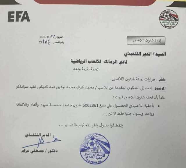 وأوضح المصدر أن الخطاب تم إحالته إلى الشئون القانونية بنادي الزمالك، لدراسة الموقف واتخاذ الإجراءات اللازمة لتقديم استئناف رسمي ضد القرار الصادر لصالح اللاعب، في محاولة لتسوية الأزمة أو تقليص المبلغ المستحق.