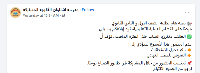 وشددت التعليمات على ضرورة اتخاذ الإجراءات المناسبة تجاه حالات الغياب المتكررة، مؤكدةً أن الانضباط في الحضور هو أحد عوامل تحقيق التفوق والنجاح الدراسي.