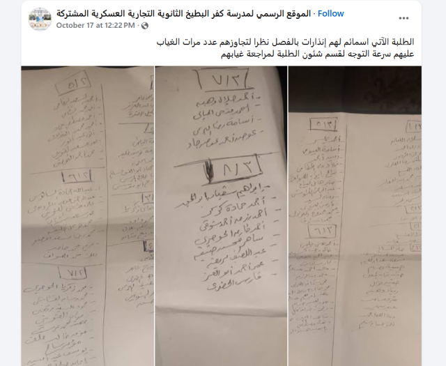 وحذرت المدارس الطلاب متكرري الغياب من أن عدم الحضور سيؤدي إلى: المنع من دخول الامتحانات ، والتعرض للفصل النهائي.