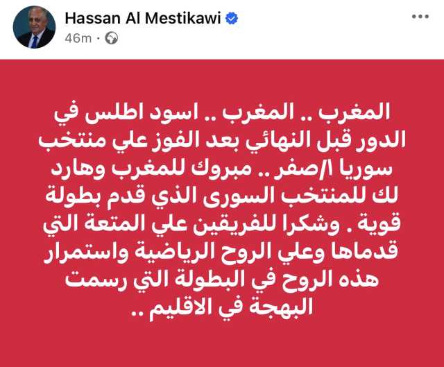 وكتب المستكاوي عبر حسابه الشخصي بموقع فيسبوك: “المغرب .. المغرب .. اسود اطلس في الدور قبل النهائي بعد الفوز علي منتخب سوريا ا/صفر، مبروك للمغرب وهارد لك للمنتخب السورى الذي قدم بطولة قوية”.