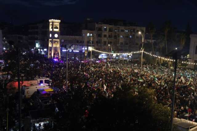 وتدفقت الحشود إلى ساحة الساعة في وسط حمص، لتتحول في هذه الليلة إلى منصة مفتوحة للاحتفال.