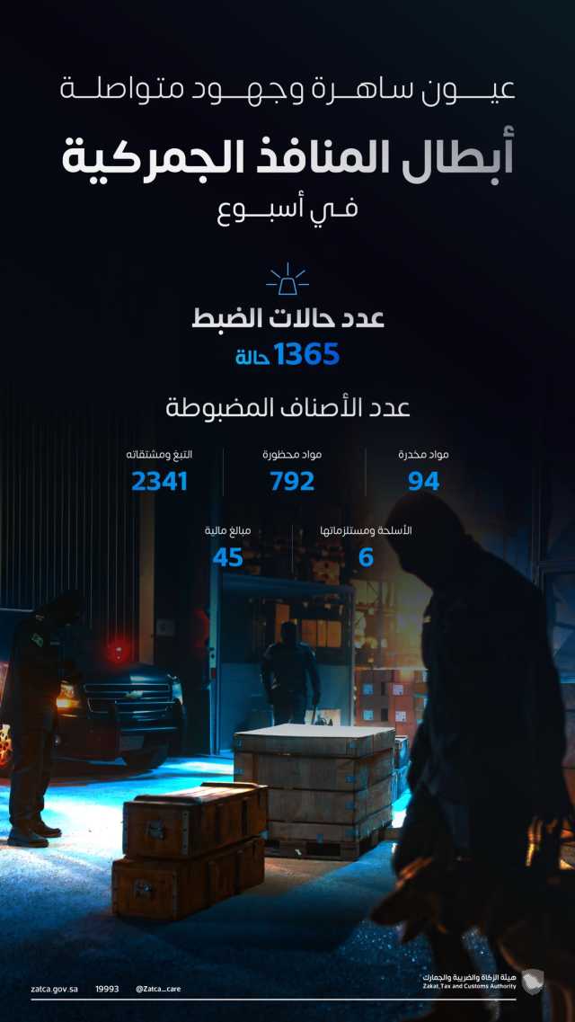 سجلت المنافذ الجمركية البرية والبحرية والجوية 1365 حالة ضبط للممنوعات، وذلك في إطار الجهود المستمرة التي تبذلها هيئة “الزكاة والضريبة والجمارك” لتعزيز الجانب الأمني وحماية المجتمع من الممنوعات بمختلف أنواعها وأشكالها.