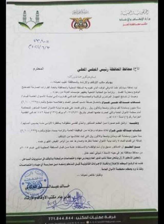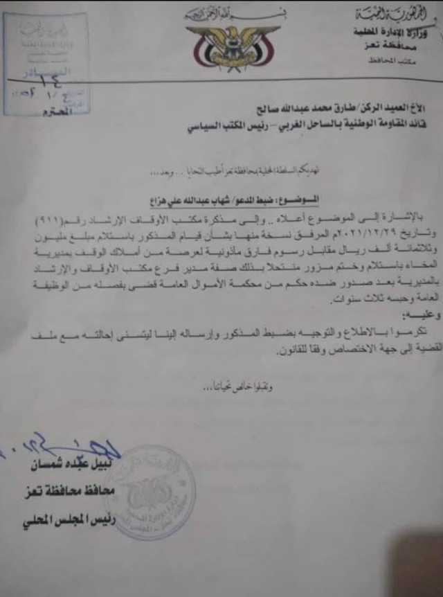 وحسب مذكرة لمحافظ تعز، نبيل شمسان، رقم (14) صادرة بتاريخ 4 يناير/كانون الثاني 2022، موجهة للعميد طارق صالح طلب فيها بتسليم المتهم شهاب عبدالله هزاع أحد موظفي مكتب الأوقاف في تعز ، المدان بتهم فساد وانتحال وتزوير.حتى يتسنى إحالته إلى محكمة الأموال العامة.