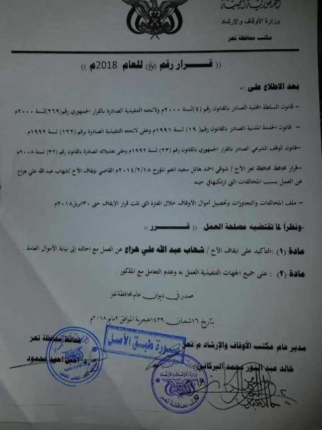 وكانت سلسلة من الأحكام القضائية والمراسلات الرسمية، أدانت هزاع أحد موظفي مكتب الأوقاف في تعز بتهم فساد وانتحال صفات رسمية وتزوير أختام.