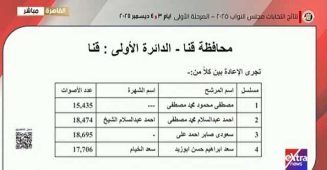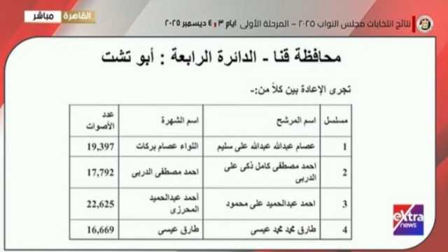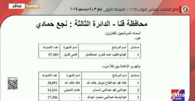 أعلنت الهيئة الوطنية للانتخابات، خلال مؤتمر صحفي اليوم، برئاسة القاضي حازم بدوي، نتيجة الدوائر الملغاة بمحافظة قنا ضمن المرحلة الأولى من انتخابات النواب 2025.