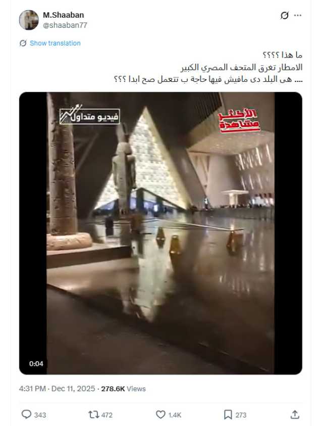 نال الفيديو عشرات الآلاف من المشاهدات في منصة إكس وحدها، مصحوبًا بوصف مُضلل يقول: "غرق المتحف المصري الكبير بعد تسرب مياه الأمطار داخله، المتحف تم افتتاحه قبل أشهر قليلة".