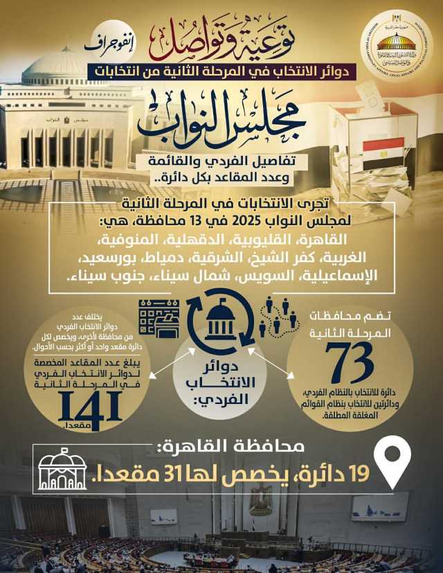 أصدرت وزارة الشؤون النيابية والقانونية والتواصل السياسي، بيانًا قالت فيه إنها بدأت سلسلة المحتوى السياسي التوعوي المتعلق بانتخابات المرحلة الثانية لمجلس النواب 2025، والتي تنشر فيها كل ما يتعلق بدوائر الانتخاب في هذه المرحلة.
