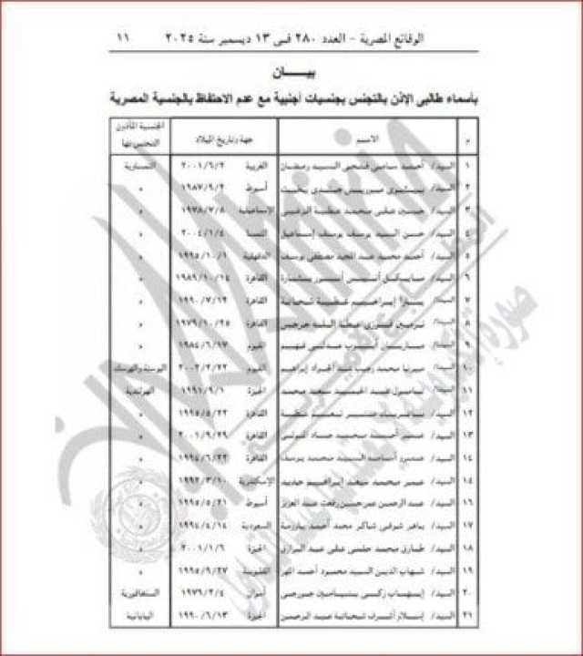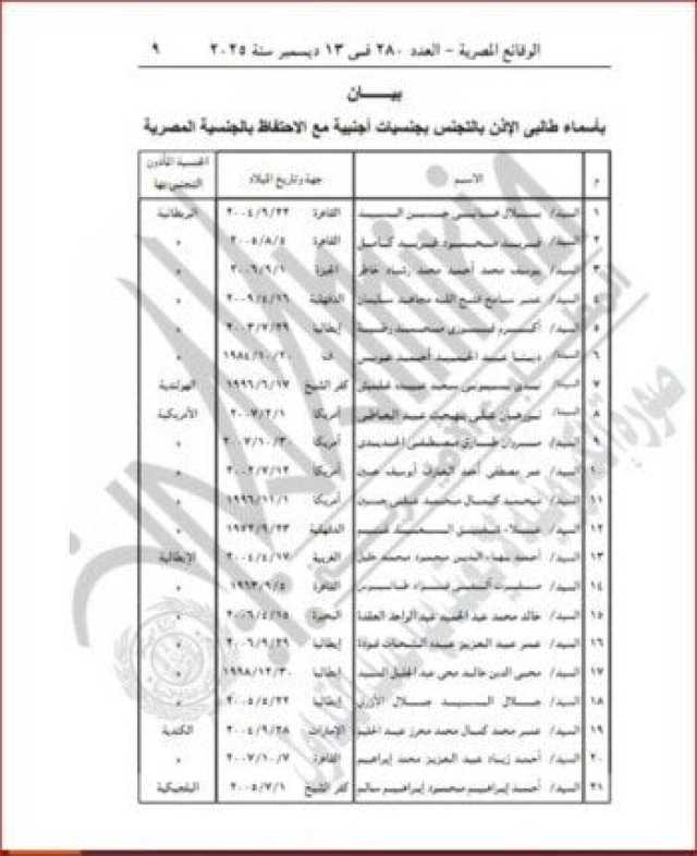 وتقرر أن يؤذن لكل من 43 مواطنًا والمدرجة أسماؤهم بالبيان المرفق بالتجنس بالجنسية الأجنبية الموضحة قرين اسم كل منهم، مع احتفاظهم بالجنسية المصرية.