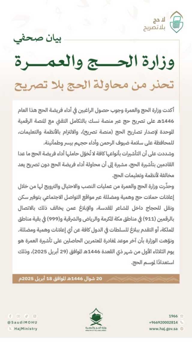 ذرت #وزارة_الحج والعمرة #السعودية من محاولة #الحج_بلا_تصريح ومن #حملات_الحج_الوهمية، وذلك مع اقتراب موسم الحج للعام الهجري 1446.