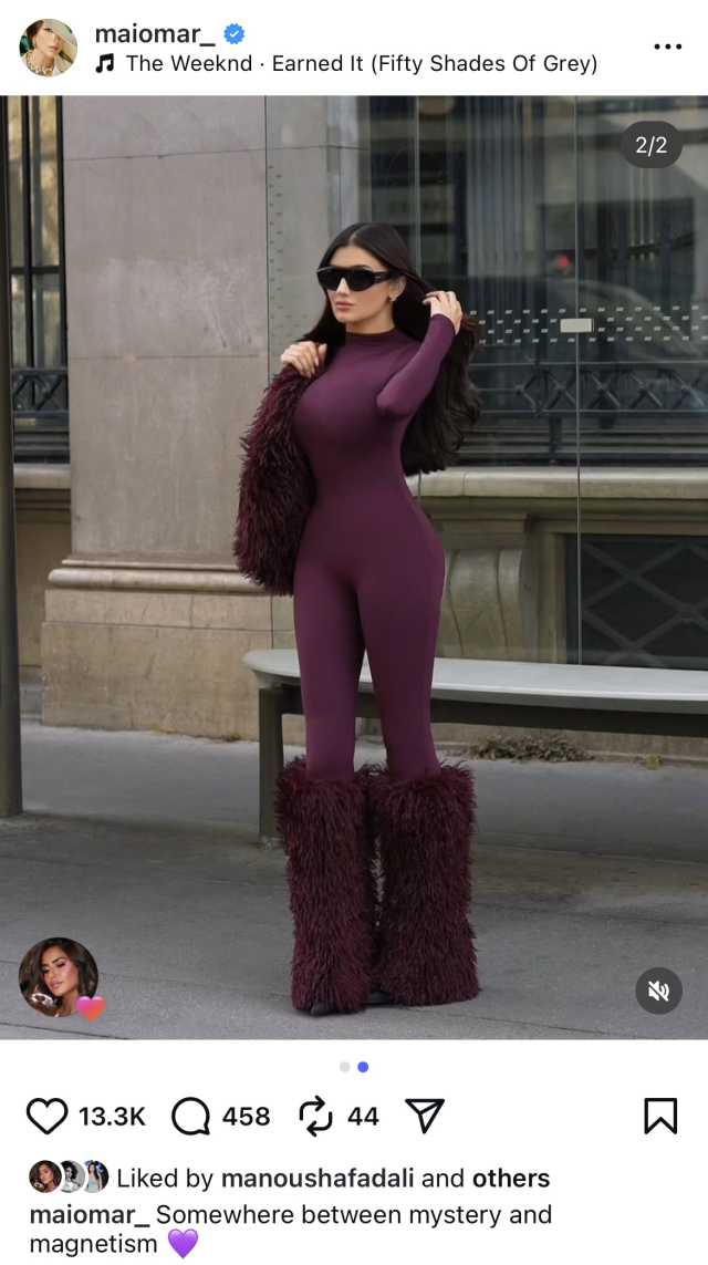 وظهرت مي عمر في الصور بإطلالة جذابة جريئة مرتدية جمبسوت مجسمة باللون الموف ،كما تركت شعرها منسدلا علي كتفيها بطريقة تبرز جمالها.