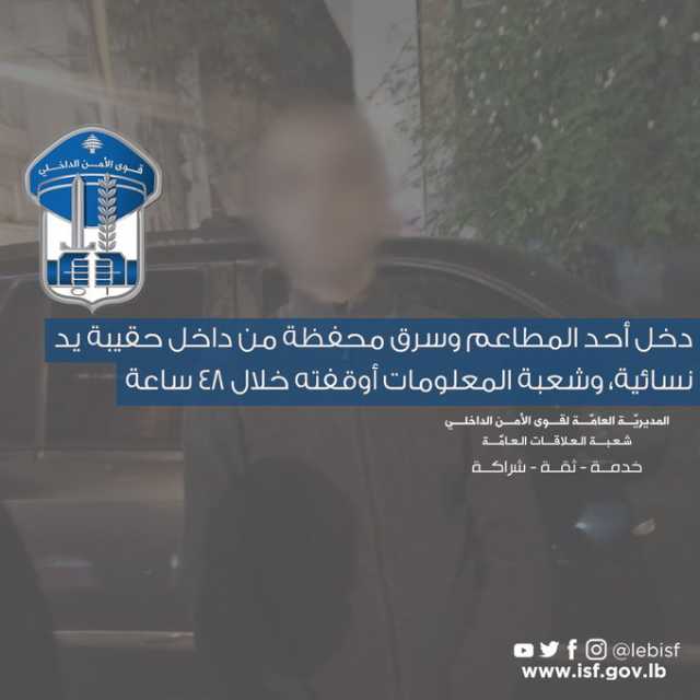 صدر عن المديريّة العامّة لقوى الأمن الدّاخلي ـ شعبة العلاقات العامّة البلاغ التّالي: بتاريخ 14-11-2025، ادّعت المواطنة ل. ح. (مواليد عام ٢٠٠٤) أنّها وأثناء وجودها داخل مطعمٍ في محلّة النّهر – بيروت، أقدم شخصٌ مجهول الهويّة على سرقة محفظتها وتحتوي مبلغًا من المال ومستندات خاصة، من داخل حقيبتها التي تركتها على أحد المقاعد داخل المطعم.