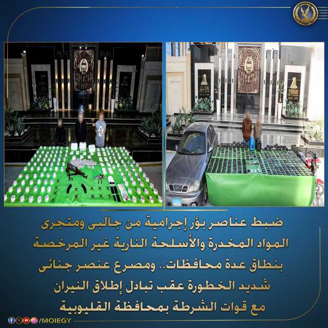 فى إطار مواصلة وزارة الداخلية توجيه الضربات الإستباقية للبؤر الإجرامية جالبى ومتجرى المواد المخدرة والأسلحة النارية غير المرخصة .. فقد أكدت معلومات وتحريات قطاع مكافحة المخدرات والأسلحة والذخائر غير المرخصة بالتنسيق مع أجهزة الوزارة المعنية قيام بؤر إجرامية بنطاق عدد من المحافظات تضم (عناصر جنائية شديدة الخطورة) بجلب كميات من المواد المخدرة والأسلحة النارية غير المرخصة تمهيداً للإتجار بها.