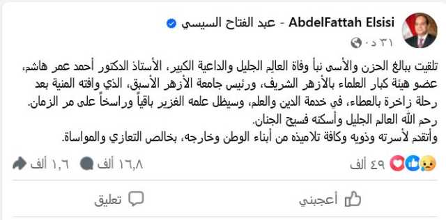 نعى الرئيس عبدالفتاح السيسي، العالم الجليل الدكتور أحمد عمر هاشم، عبر صفحته الرسمية على موقع التواصل الاجتماعي "فيسبوك"، حيث قال: تلقيت ببالغ الحزن والأسى نبأ وفاة العالِم الجليل والداعية الكبير، الأستاذ الدكتور أحمد عمر هاشم، عضو هيئة كبار العلماء بالأزهر الشريف، ورئيس جامعة الأزهر الأسبق، الذي وافته المنية بعد رحلة زاخرة بالعطاء، في خدمة الدين والعلم.