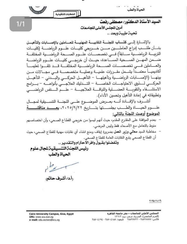 وأشار نقيب العلاج الطبيعي، إلى أن الخطاب الرسمي الموجه من الدكتور أشرف حاتم إلى أمانة المجلس الأعلى للجامعات، تضمن توصية بمخاطبة وزير العمل بضرورة إيقاف ومنع إنشاء أي نقابات مهنية أو لجان عمالية دخيلة على القطاع الصحي، مؤكدا أن القطاع الصحي يتبع النقابات العامة الرسمية المنظمة بقوانين الدولة والمختصة بمزاولة المهن الطبية.