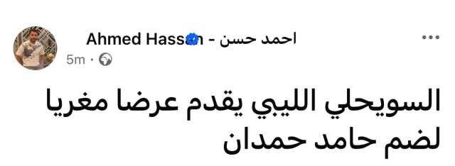 وكتب أحمد حسن عبر حسابه الشخصي بموقع فيسبوك: “السويحلي الليبي يقدم عرضا مغريا لضم حامد حمدان”.