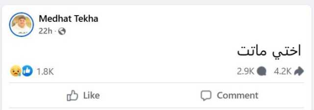 وفاة شقيقة الفنان مدحت تيخاوكتب الفنان مدحت تيخا منشور عبر صفحته الشخصية بموقع «فيس بوك» يعلن من خلال وفاة شقيقته، قائلاً «أختي ماتت».