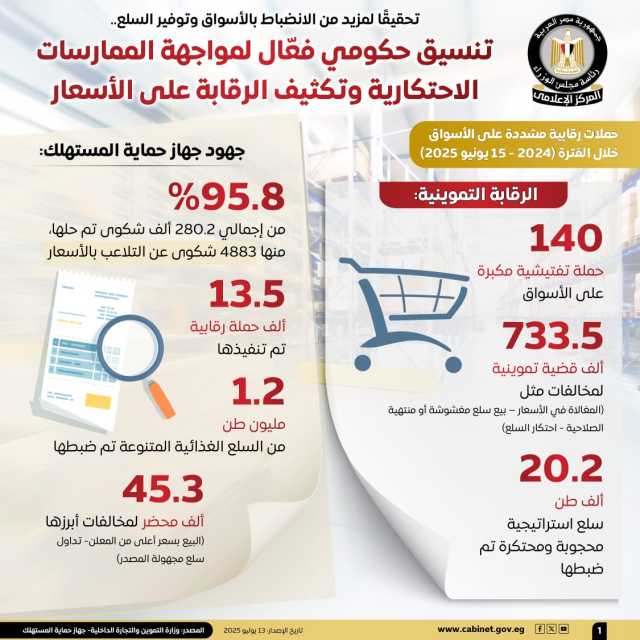 نشر المركز الإعلامي لمجلس الوزراء، عددًا من الإنفوجرافات عبر منصاته على مواقع التواصل الاجتماعي، استعرض من خلالها جهود الدولة في تحقيق الانضباط بالأسواق وضمان توافر السلع الأساسية، من خلال تنسيق حكومي فعال لمواجهة الممارسات الاحتكارية وتكثيف الرقابة على الأسعار، الأمر الذي انعكس على تحقيق معدل التضخم العام لحضر الجمهورية معدلات سالبة على أساس شهري لأول مرة منذ بداية العام، خلال يونيو ٢٠٢٥.