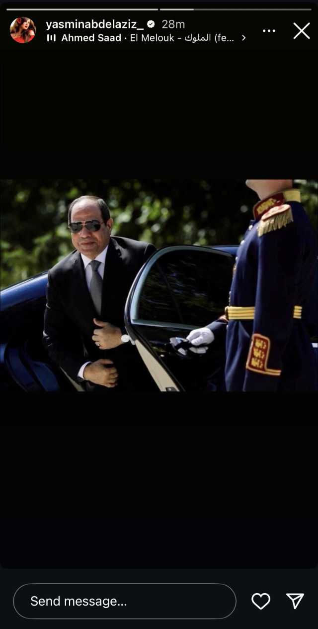 وشاركت ياسمين عبد العزيز، صورة الرئيس عبد الفتاح السيسي، عبر حسابها على نستجرام، مصحوبة بأغنية “جات الملوك” للفنان أحمد سعد، معربة عن تقديرها لجهوده.